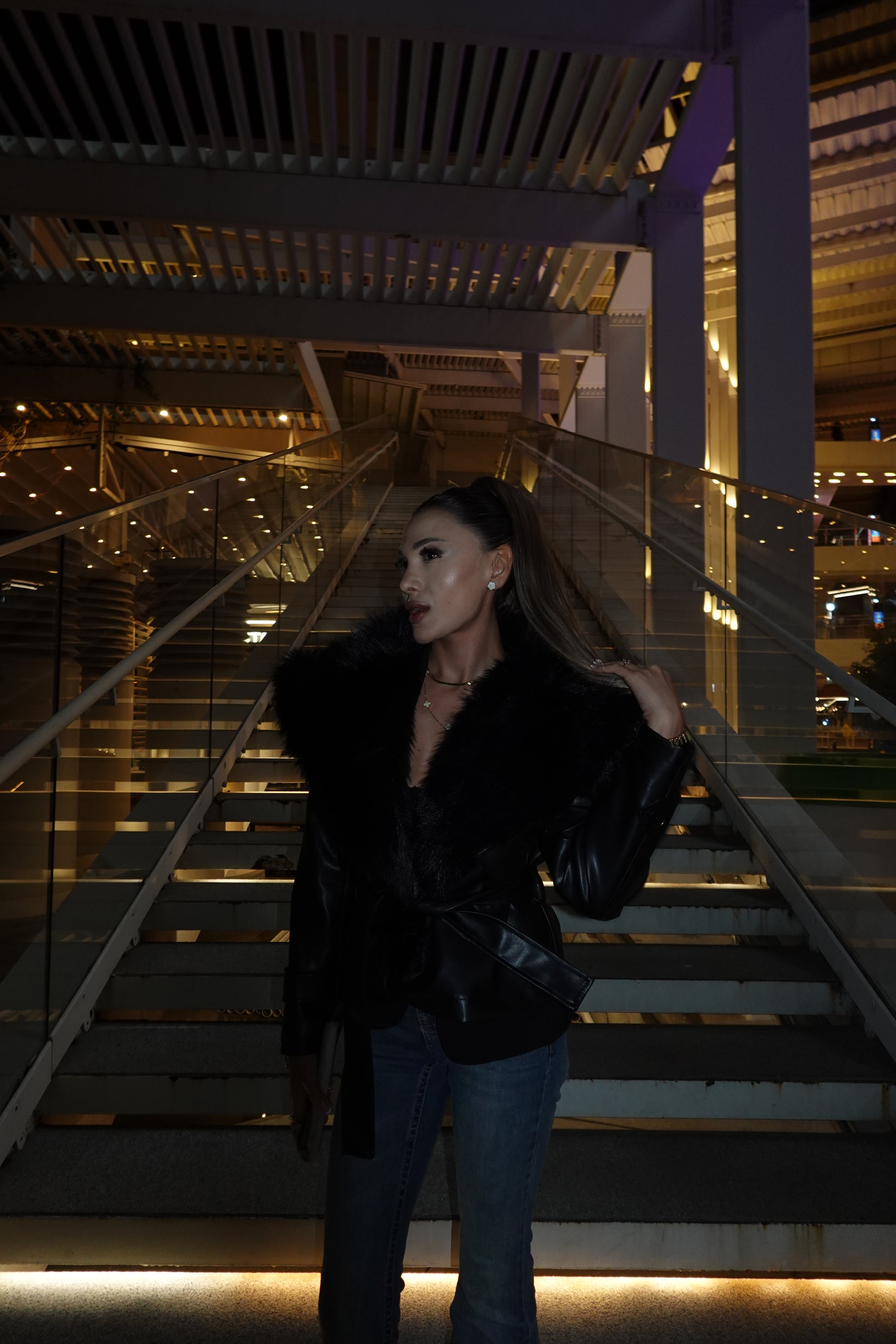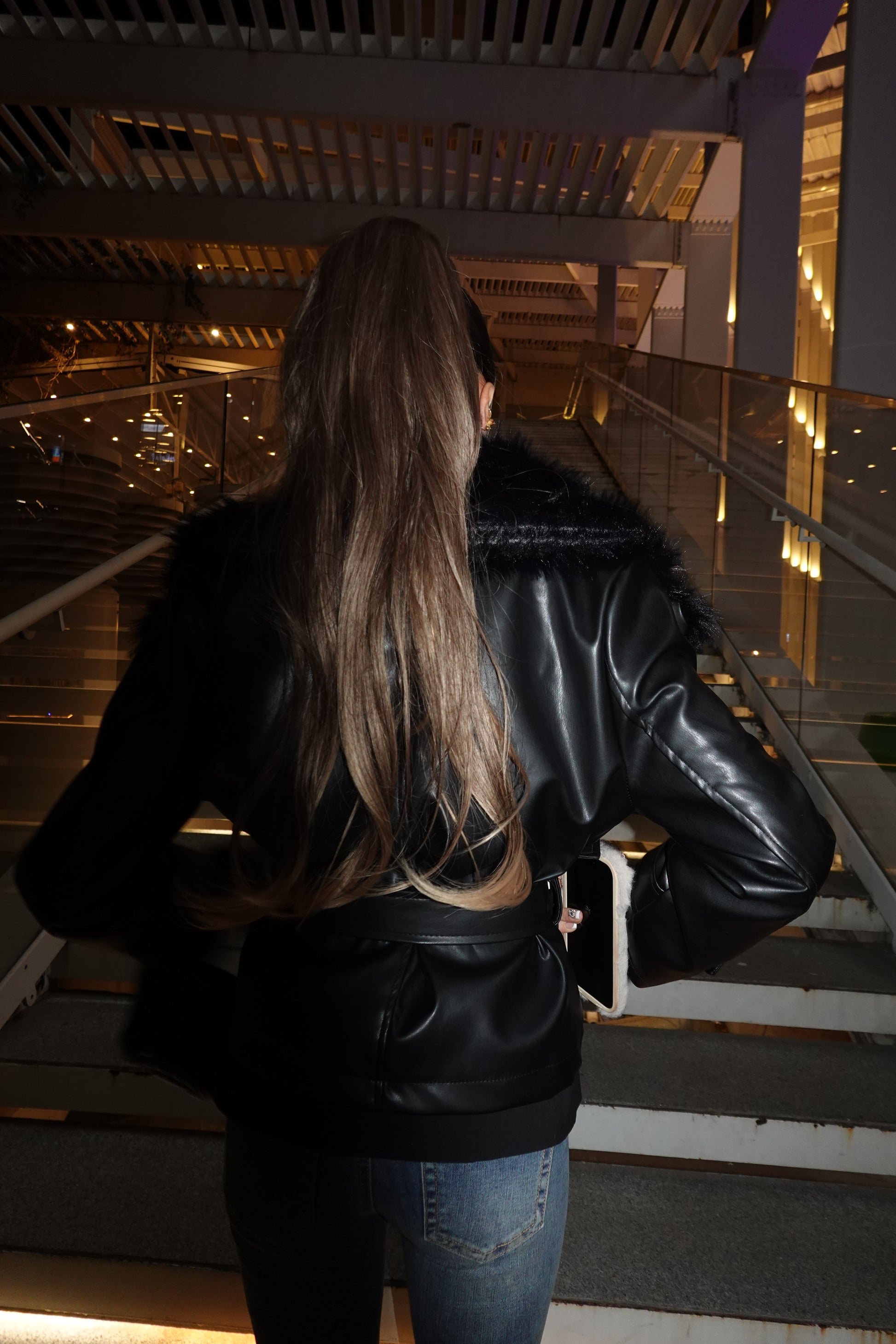 AYNA | Noir Kürklü Deri Ceket, lüks kürk detayları ve parlak deri dokusuyla kusursuz bir siluet yaratır.
