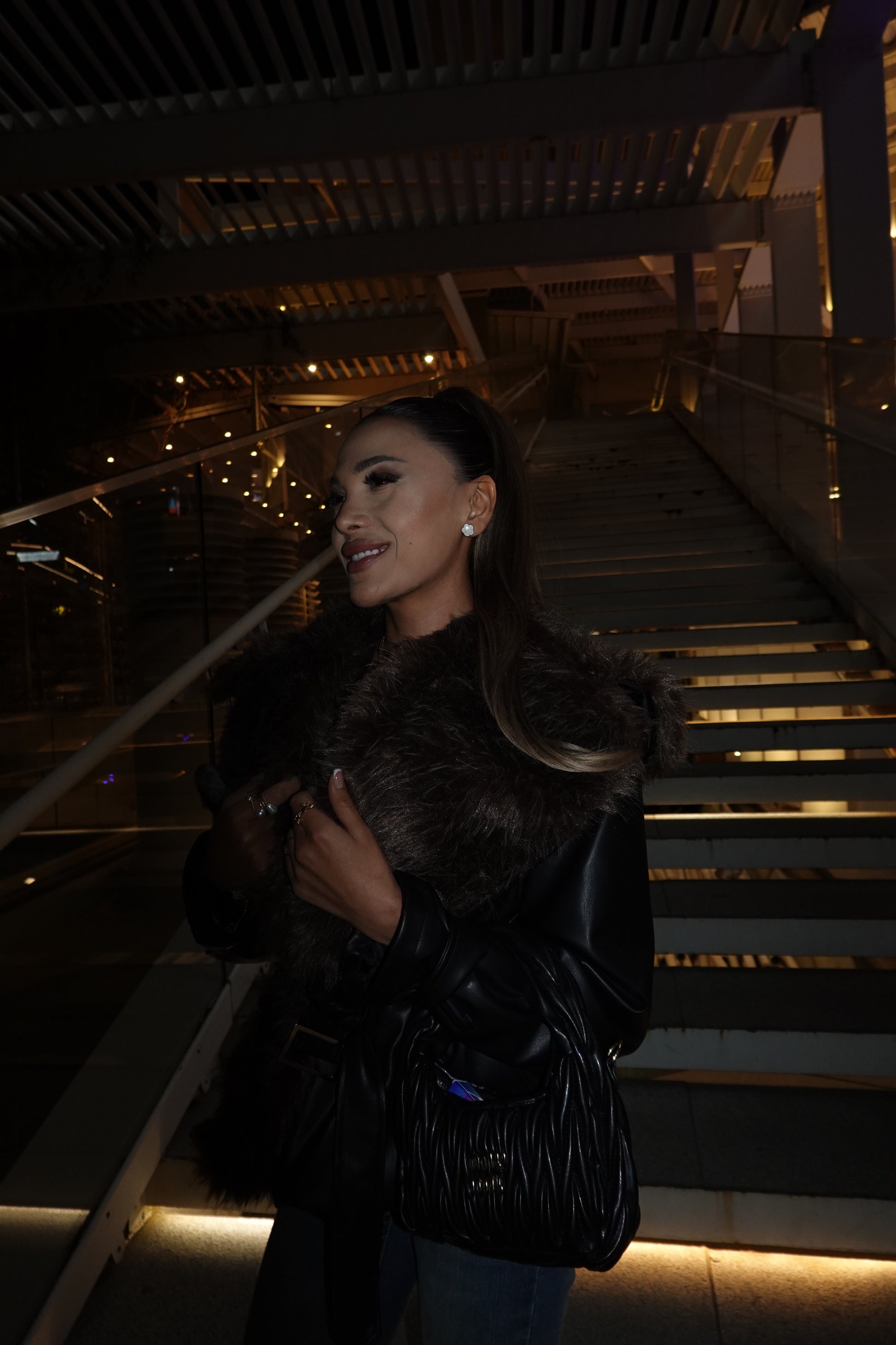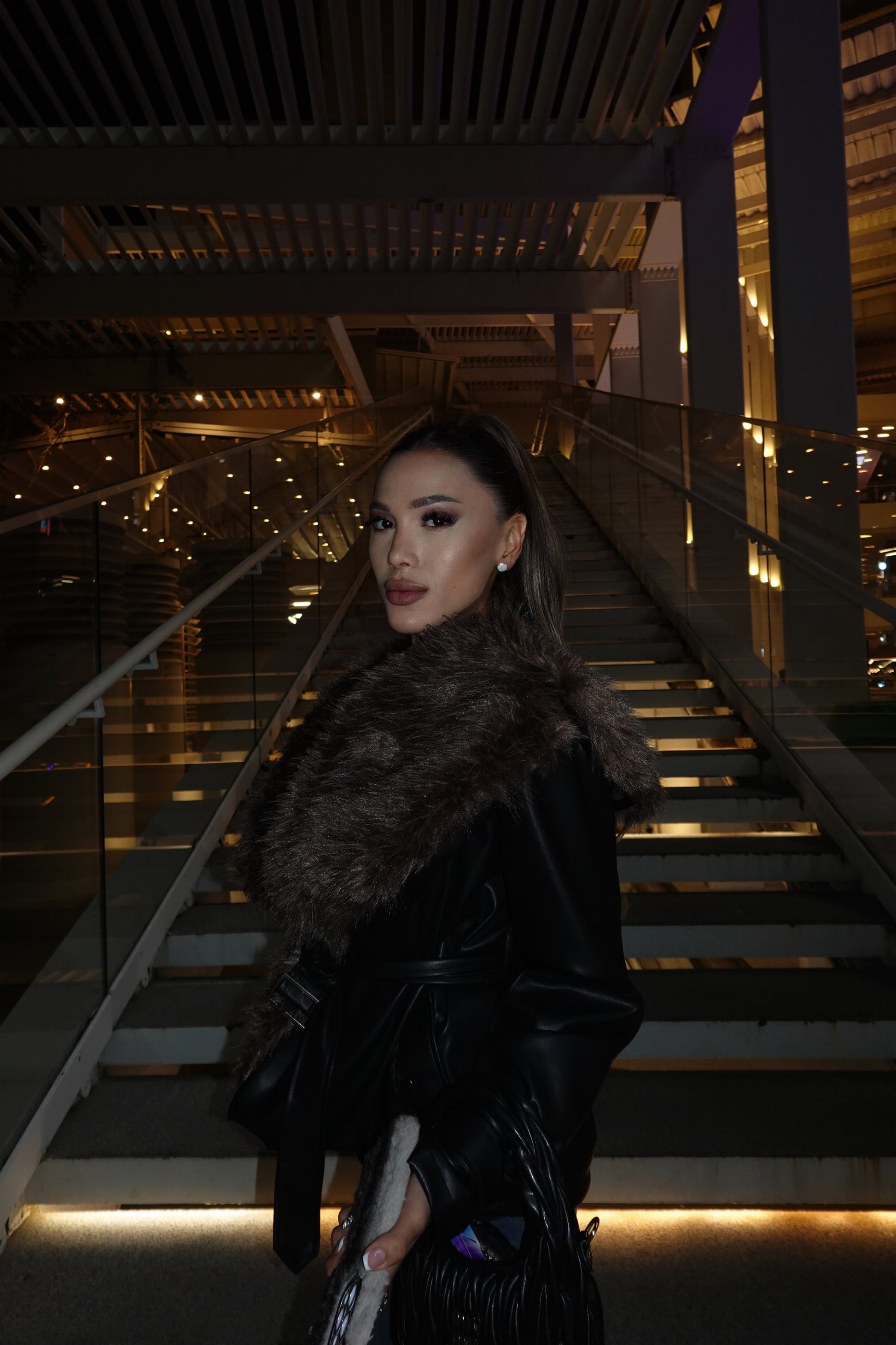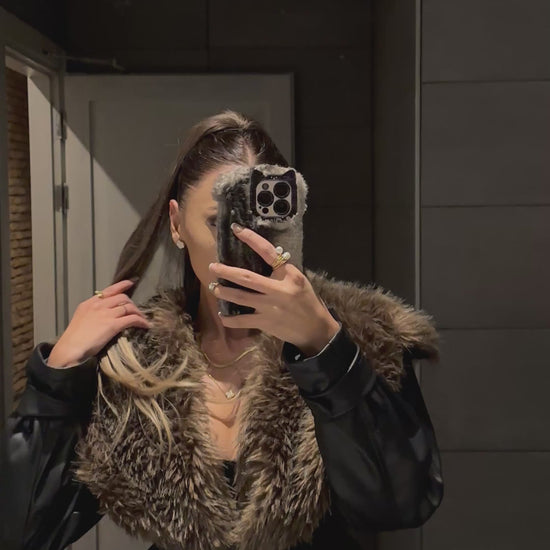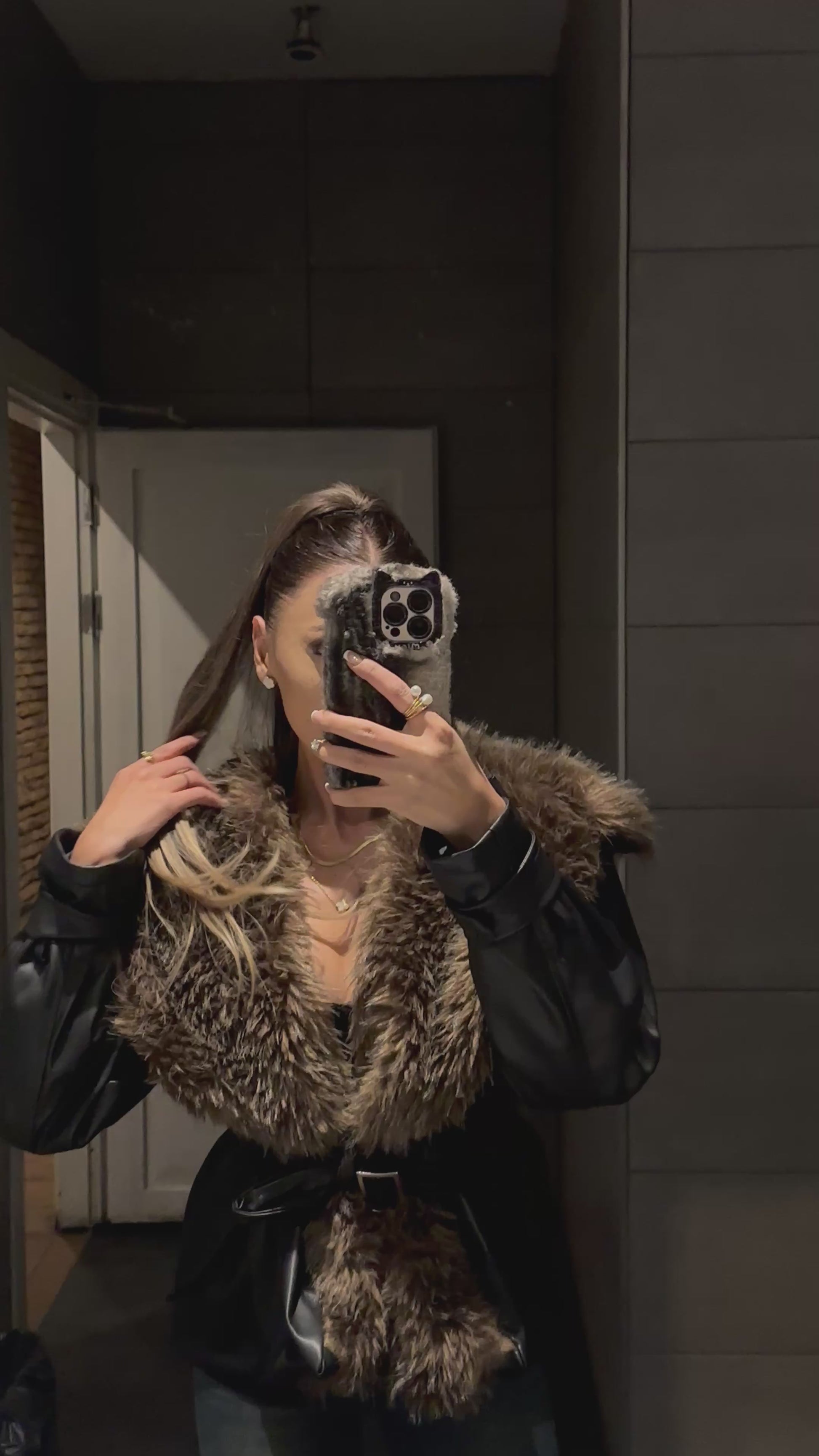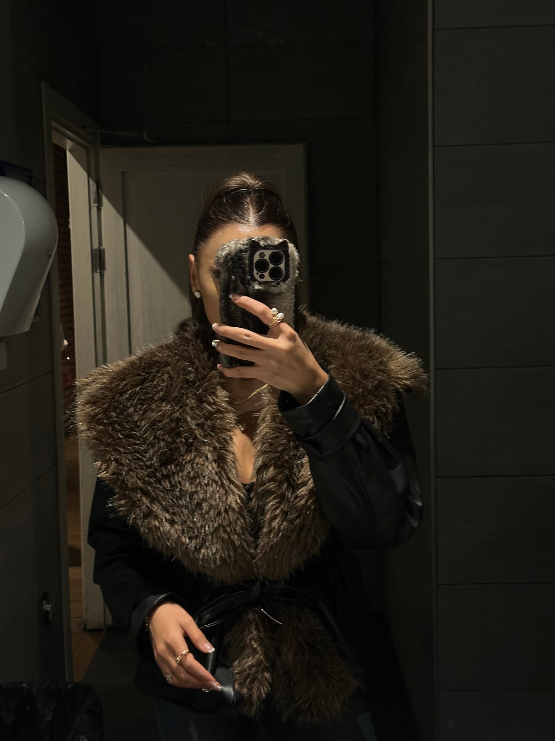 AYNA | Obsidyen Kürklü Ceket, parlak deri dokusu ve yoğun kürk detayıyla sezonun en iddialı dış giyim parçası.