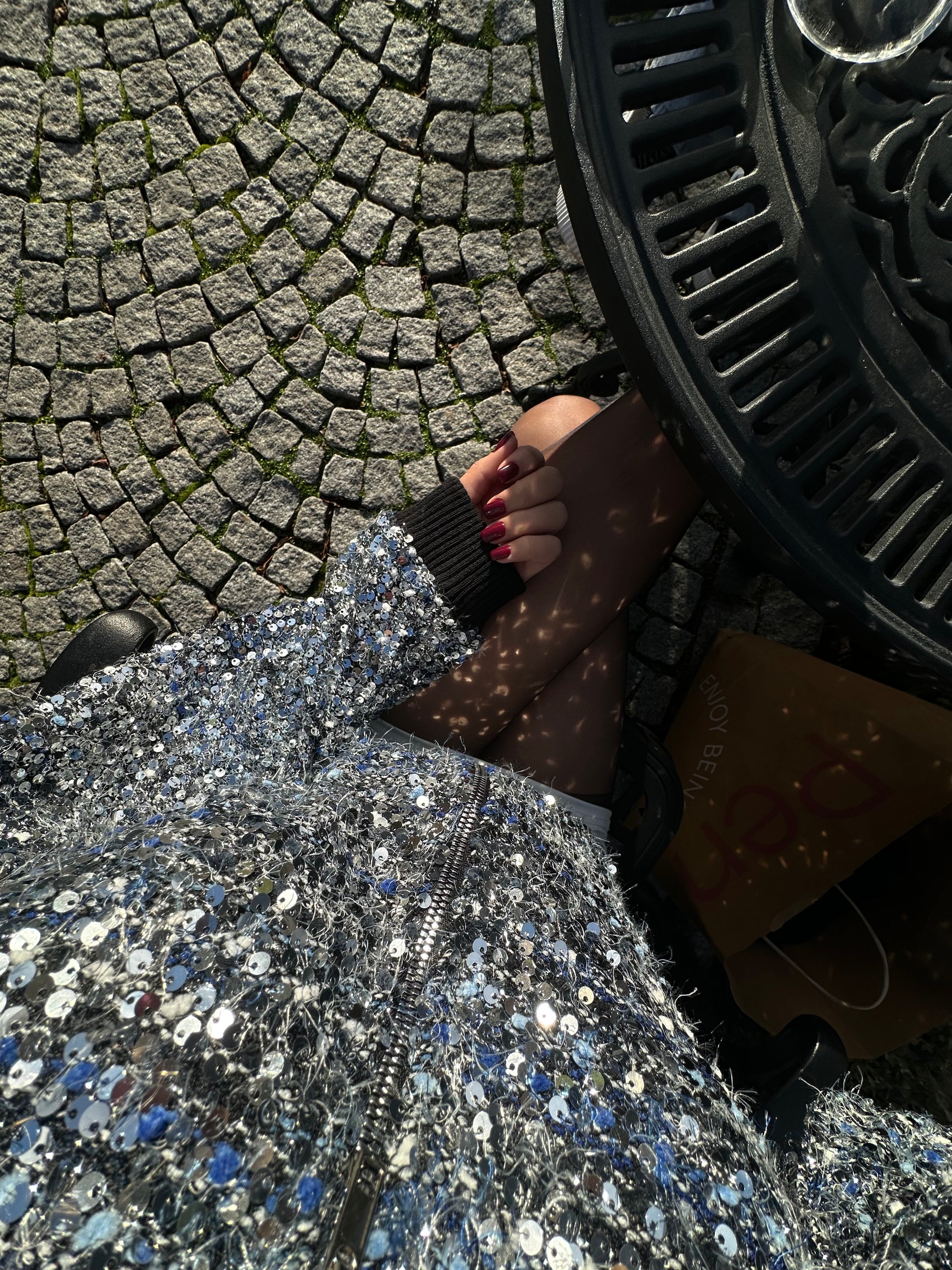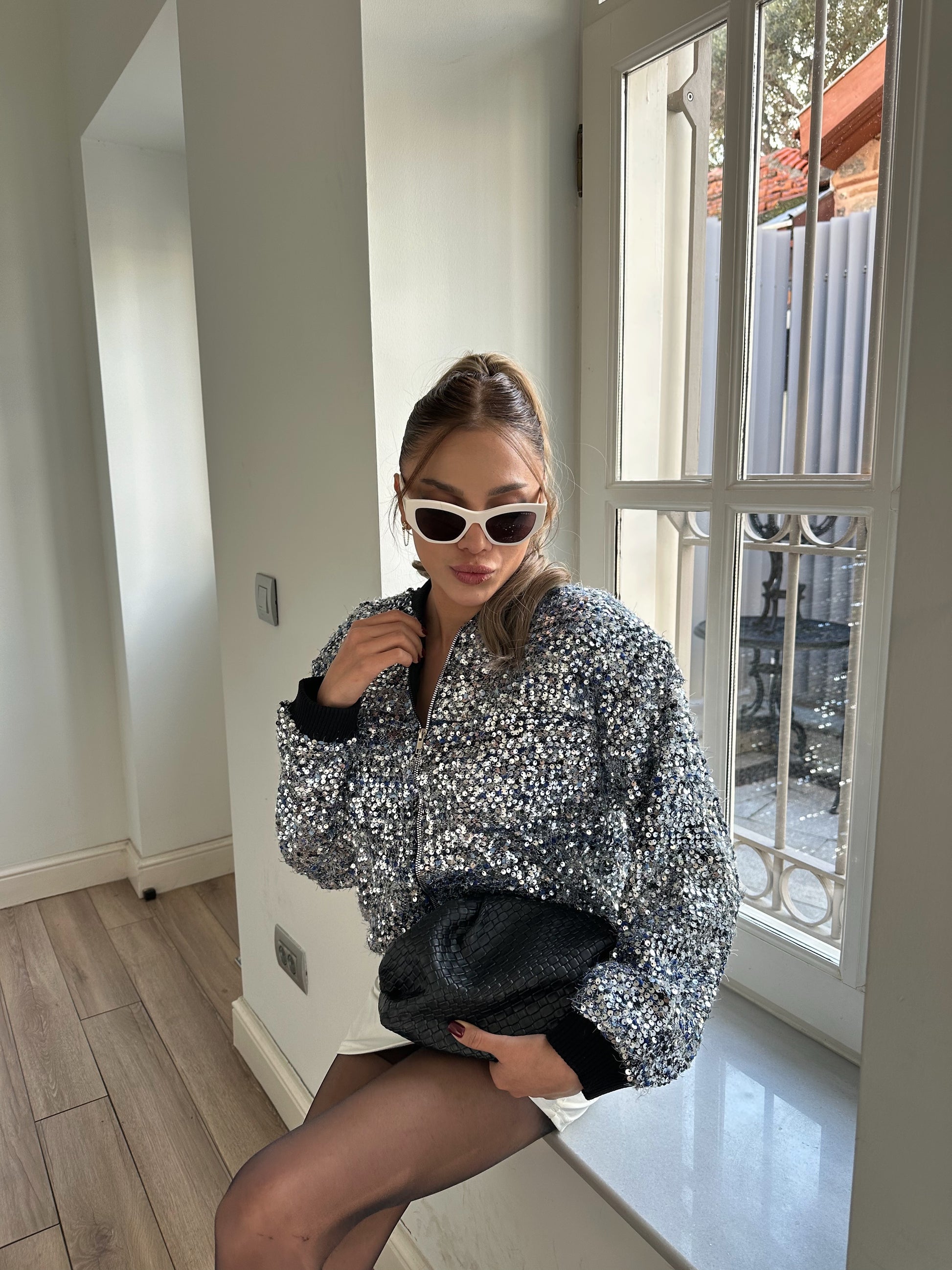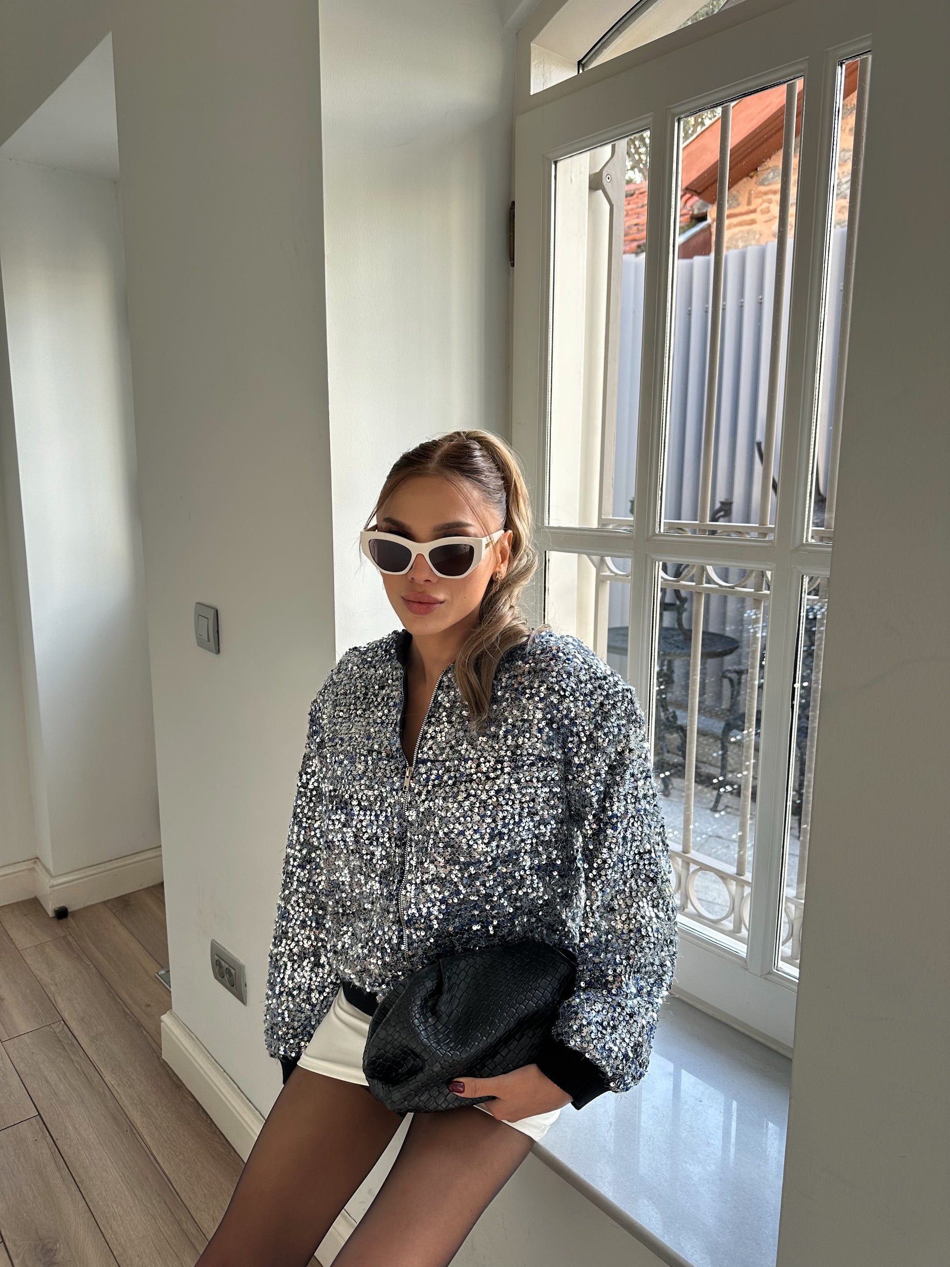 Parıltı Bomber; modern bomber formunu yoğun payet dokusuyla buluşturan, iddiasını sessizce ortaya koyan özel bir parça.