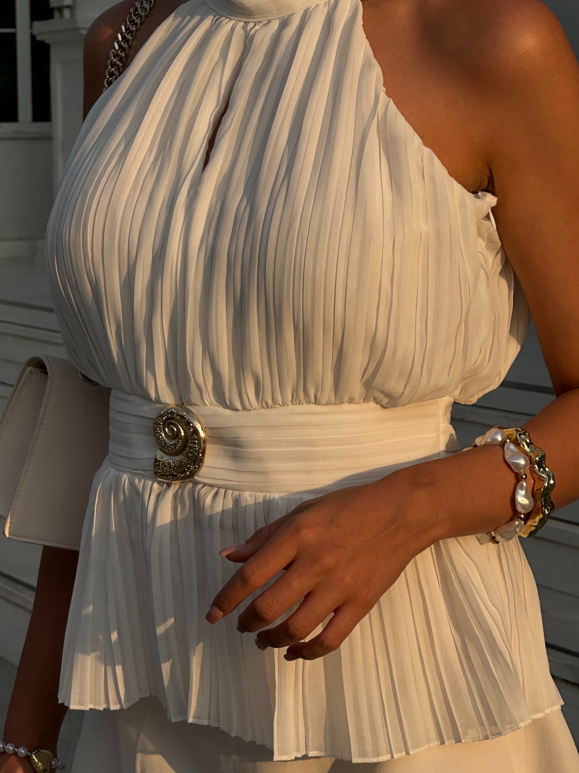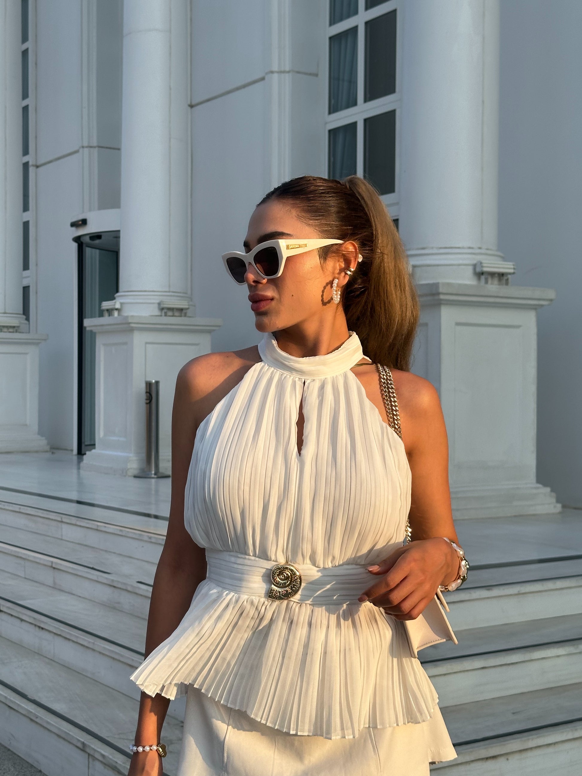 Seren Üst, zarif pilise detayları ve drapeli tasarımıyla minimal ama güçlü bir siluet yaratır.