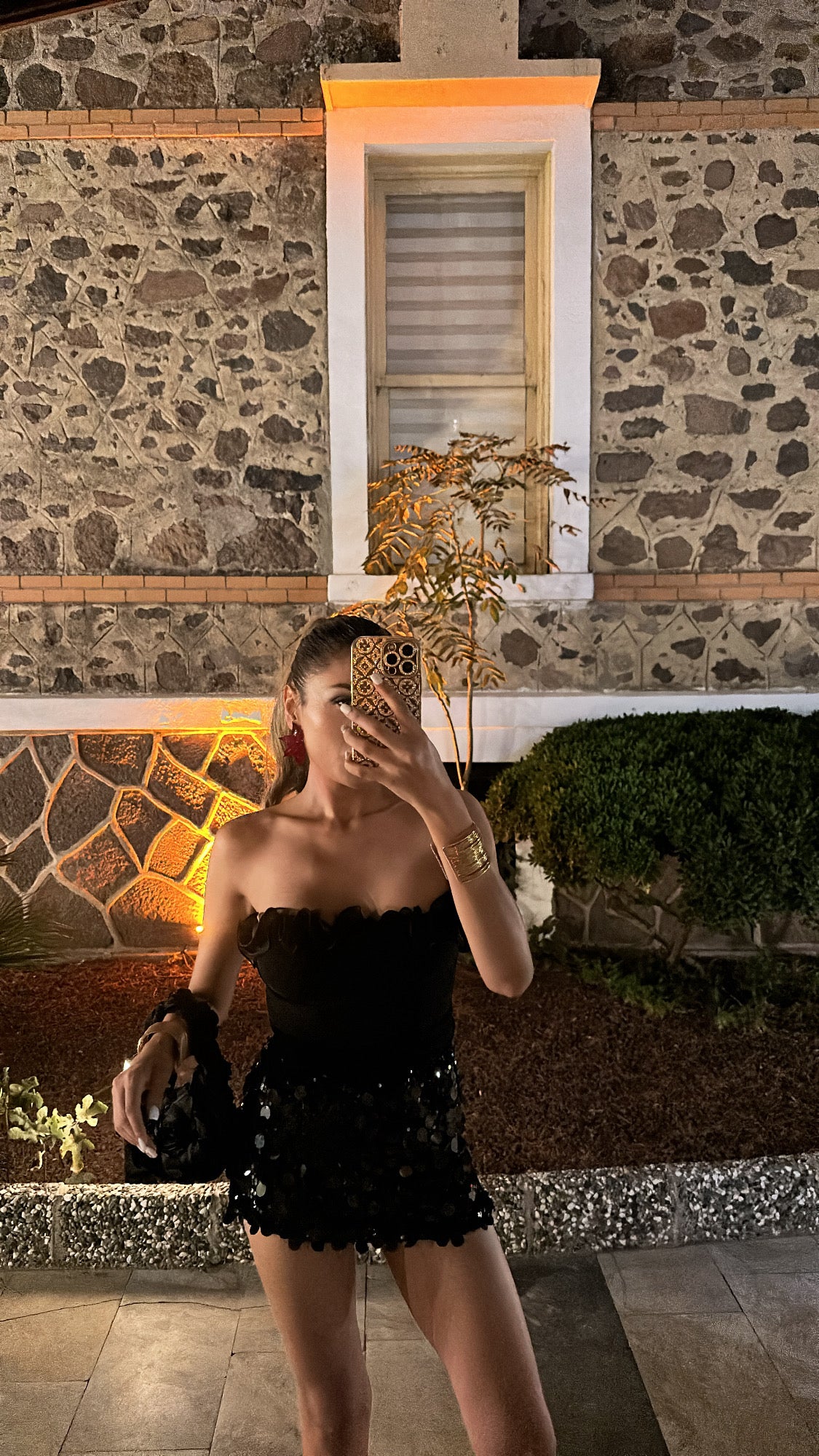 Simsiyah, straplez kesimiyle zarafeti temsil ederken; yumuşak kumaşı ve vücuda oturan yapısıyla özgüveni yüksek bir duruş kazandırır.